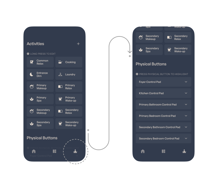 For example, if you want the bathroom and bedroom lights to remain off at night, you may do so by creating and activating an activity.